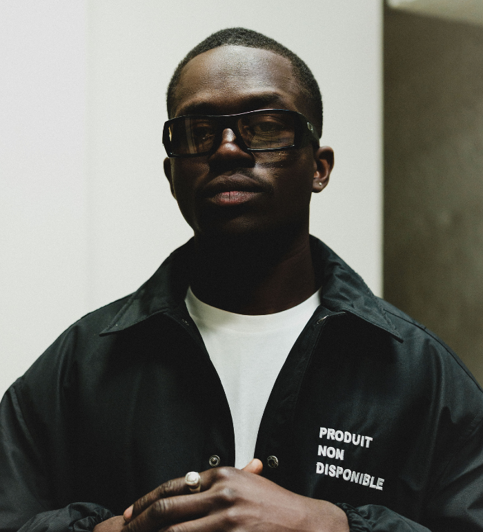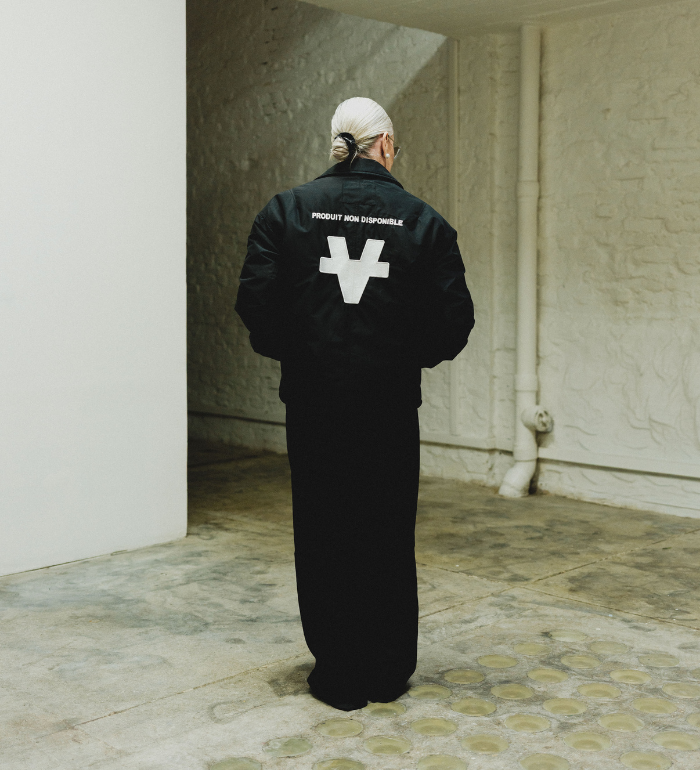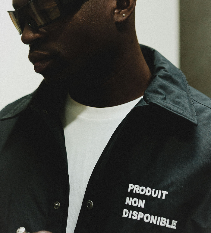 A black coach jacket with a clean front and a bold statement on the back. “PRODUIT NON DISPONIBLE” and the oversized NOMVD symbol turn an apparently unavailable item into a wearable artwork.
